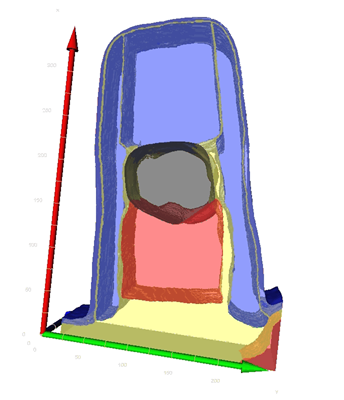 However, also the SIRT reconstruction does not produce easily quantifiable intensities that can be directly segmented by thresholding. Because of convergence limitations, there is a dependence of the reconstructed intensities of the averge density overlapping in the different projections. As one example, when reconstructing nanoparticles with different diameter, this results in decreasing intensities with decreasing particle diameter, which makes an accurate segmentation very difficult.