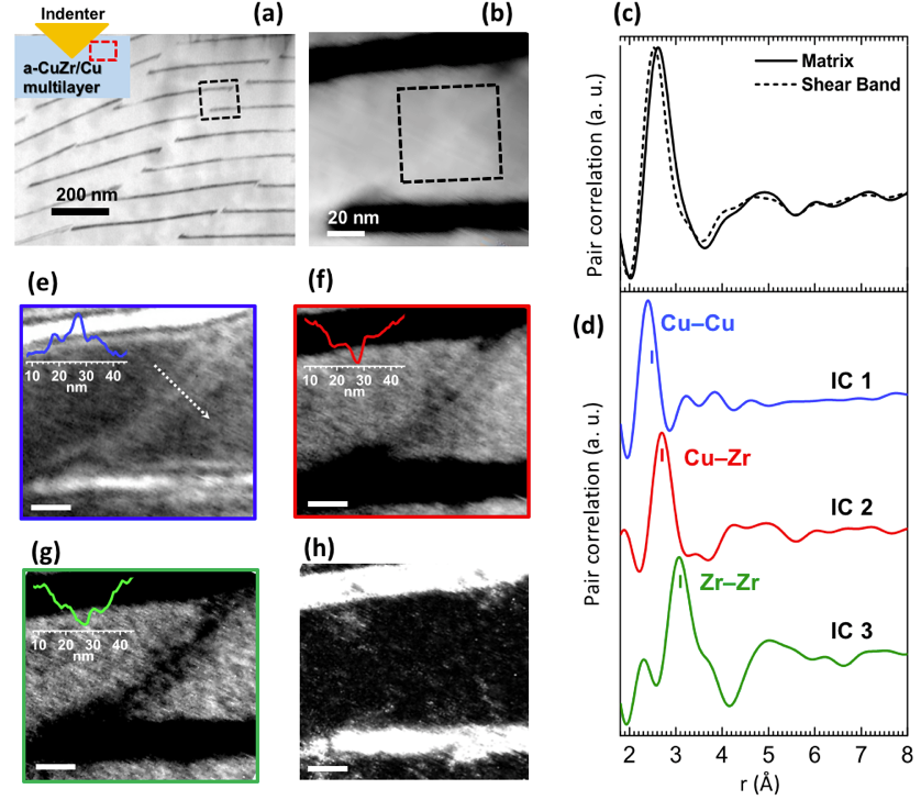 Application of BMG are strongly limited by their poor ductility and lack of work hardening due to localized shear band formation during plastic deformation. However, the difficulties in characterizing the structure of the material in the shear band, which is only a few nanometer wide, embedded in the matrix material, and exhibits very weak contrast with conventional characterization techniques (Figure 2b) limits the understanding of shear band formation and hence the deformation mechanisms of BMGs. Using PDF mapping and independent component analysis we can overcome the challenges to clearly visualize the shear bands and gain insights to their atomic and chemical structures in terms of bonding and coordinations.
