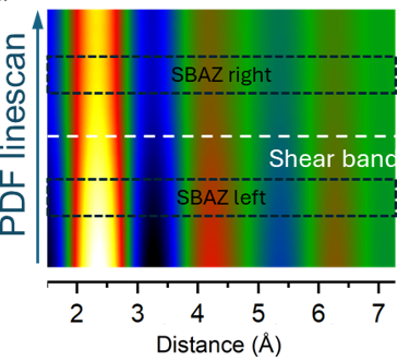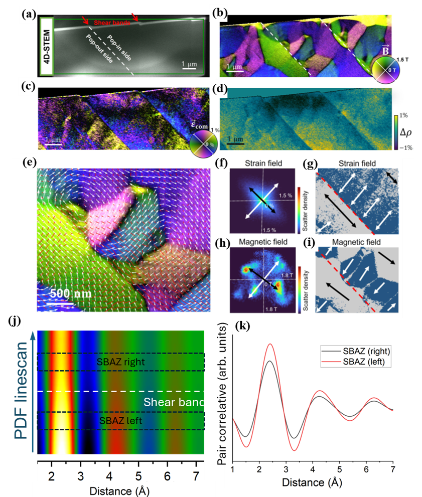 Advanced STEM-PDF applications include the study of shear bands in metallic glasses, where spatially resolved PDFs reveal asymmetric structural changes, compositional segregation, and the breakdown of geometrically favored packing motifs. Extensions of large-angle Lorentz 4D-STEM further enable simultaneous mapping of strain, density, and magnetic fields from the same dataset. By correlating functional fields with local pair correlations, this multimodal framework links atomic-scale packing to magnetoelastic behavior and deformation physics.