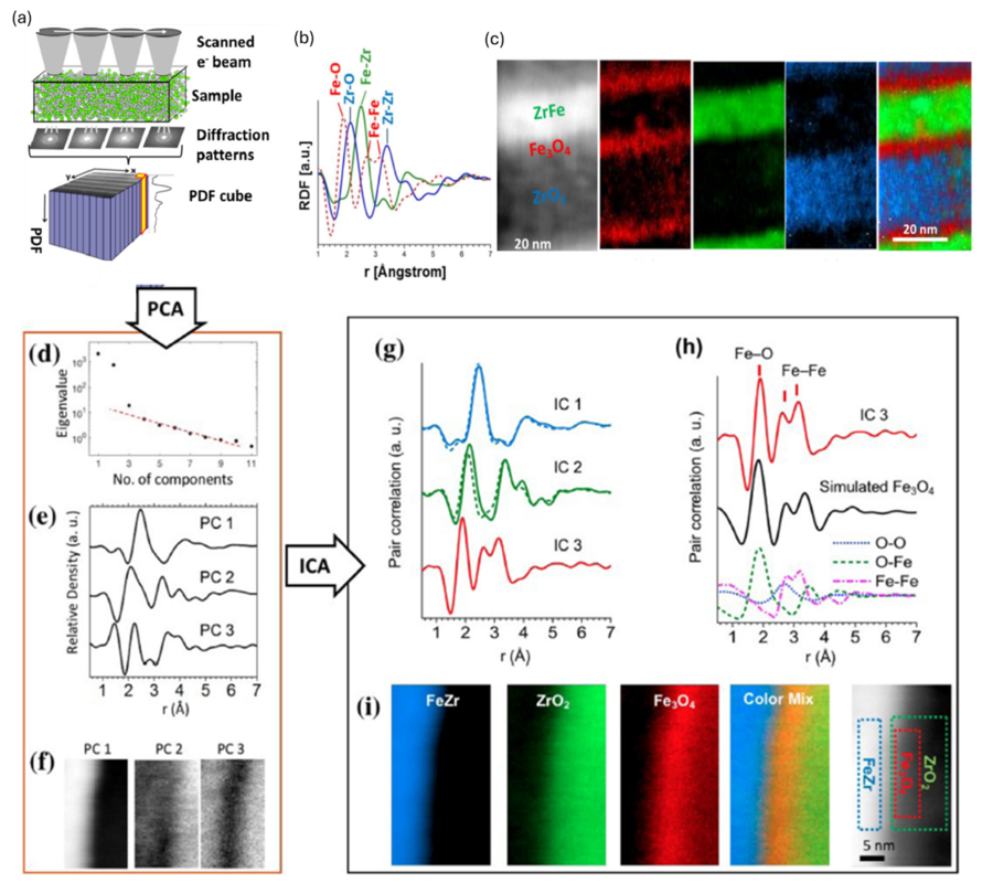 Figure 1. 4D-STEM PDF mapping of nanoglass multilayers. (a) Schematic of 4D-STEM PDF acquisition: a nanobeam is scanned across the sample, a diffraction pattern recorded at each probe position, and the resulting stack is converted to a three dimensional PDF cube with two real-space coordinates (x, y) and an interatomic distance axis r. (b) Example PDFs from a ZrFe-based nanoglass multilayer, showing pair correlations (FeZr & ZrO2 layers and Fe3O4 interface) that distinguish the local atomic packing in different amorphous environments. (f) PDF based phase mapping of a ZrFe/Fe3O4/ZrO2 multilayer: HADDF image (left) and coefficient maps for the different amorphous phases (center) with an RGB composite (right) that visualizes their nanoscale spatial distribution. (d–f) Principal component analysis (PCA) of the PDF cube: scree plot of eigenvalues (d), first three principal component PDFs (e), and their spatial maps (f), which already reflect the presence of three structurally distinct regions. (g) Independent component PDFs obtained by applying independent component analysis (ICA) to the PCA results, separating FeZr, ZrO₂, and an additional interfacial phase. (h) Comparison of the third independent component with a simulated PDF and partial PDFs of Fe₃O₄, identifying Fe–O and Fe–Fe correlations characteristic of an iron oxide interlayer. (i) Spatial maps of the ICA coefficients, revealing the distribution of FeZr, ZrO₂, and Fe₃O₄-like interfacial regions and their correspondence with the virtual ADF image. Figures (a–d) adapted from Mu et al. 1. Figures adapted from Mu et al. 6