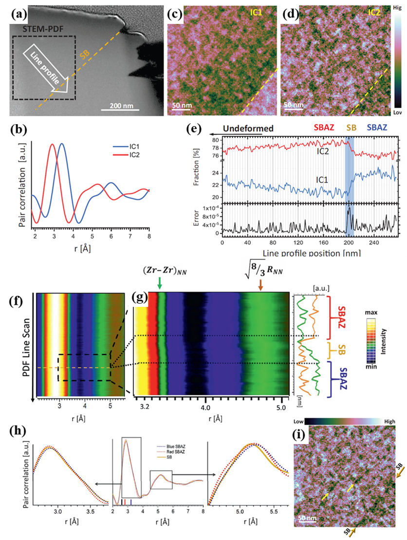Figure 2. STEM-PDF and ICA mapping of local atomic structure around a shear band of a Vitreloy 105 metallic glass. (a) STEM-HAADF image of a deformed section, indicating the region used for 4D-STEM PDF acquisition and the position of the shear band. (b) Independent-component PDFs IC1 and IC2 obtained by ICA of the STEM-PDF cube, corresponding to Zr-rich (IC1) and Zr-poor (IC2, Cu/Ni/Ti/Al-rich) local configurations. (c, d) Spatial weight maps of IC1 and IC2, revealing a sharp structural contrast across the shear band (yellow dashed line). (e) Line profile of the IC weight fractions and fitting error along the direction marked in (a), showing antisymmetric Zr-rich / Zr-poor SBAZs on either side of the shear band and a narrow region of enhanced misfit at the shear band core. (f) PDF line scan perpendicular to the shear band extracted from the STEM-PDF cube. (g) Magnified view of the line scan highlighting changes in the Zr–Zr nearest-neighbor distance and the second-shell feature associated with face-sharing tetrahedra; right-hand traces show intensity profiles in the Zr-depleted SBAZ, shear band and Zr-enriched SBAZ. (h) PDFs averaged over these three regions, illustrating the progressive change in nearest-neighbor correlations and the abrupt reduction of the face-sharing contribution in the shear band. (i) Map of the population of face-sharing tetrahedral motifs derived from the PDF amplitude at √8/3 RNN, showing depletion of geometrically favored motifs along the shear band. Panels adapted from Mu et al.Integration with 4D-STEM extends ePDF from point analysis to spatially resolved structural mapping. A nanometer-sized probe is rastered across the specimen while a diffraction pattern is recorded at each position, generating a four-dimensional dataset. Each pattern is converted into a local PDF, and stacking these results produces a three-dimensional PDF cube (x, y, r). This approach enables direct visualization of nanoscale phase separation, interfacial structure, and local packing variations that are inaccessible to conventional imaging. Multivariate statistical tools such as principal component analysis (PCA) and independent component analysis (ICA) can separate overlapping amorphous environments, revealing hidden nanophases and their bonding geometry even when projected in the same imaging volume.
